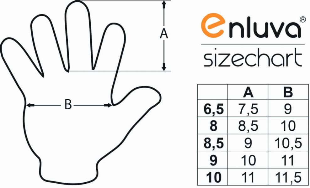 - Größe 6,5: Länge Mittelfinger (gemessen zwischen Ringfinger und Mittelfinger ) 7,5 cm, Breite Handrücken (gemessen an der breitesten Stelle) 9 cm